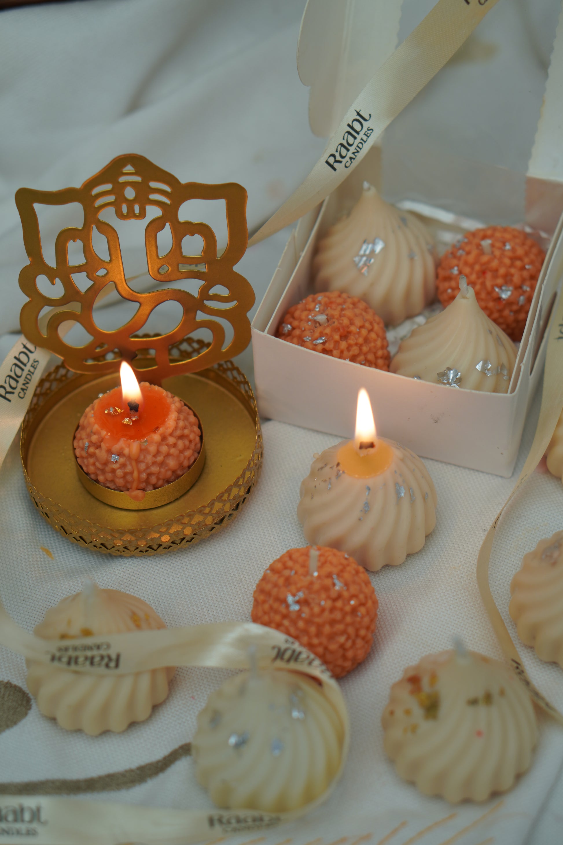 Offer your devotion in a glow as sweet as the season. Sukhkarta Glow Box is a handcrafted candle set inspired by Ganpati Bappa’s favorite treats — modaks and motichoor laddus — reimagined in pure soy wax and adorned with shimmering silver leaf.